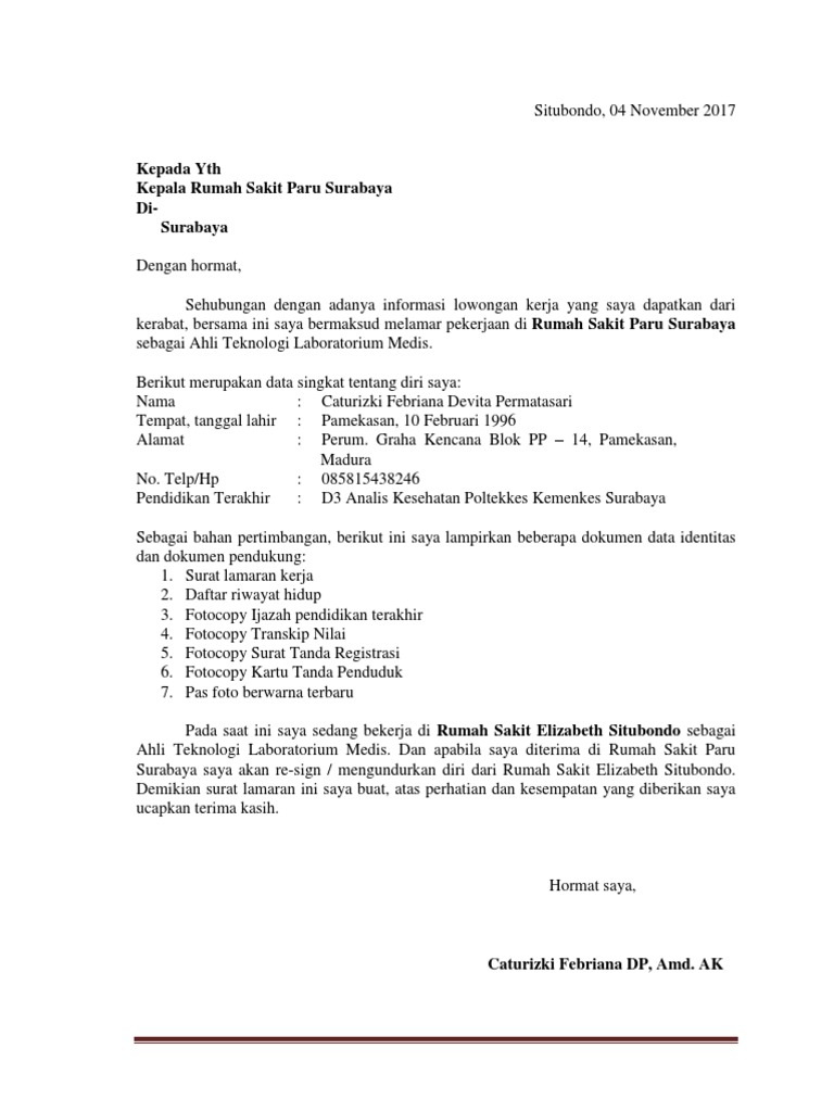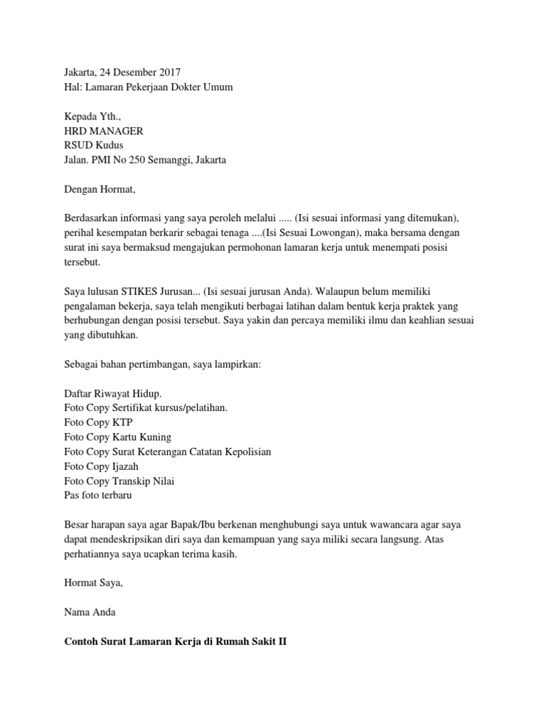 Berikut ini beberapa contoh surat lamaran kerja di rumah sakit lengkap serta bentuk.doc nya. Akan tetapi, tak sedikit yang sulit membuatnya mengingat banyak faktor yang harus hal ini supaya surat lamaran kerja yang kamu buat bisa menjadi daya tawar dan dilirik perusahaan. 3.1 tips melamar kerja yang baik. Demikian surat lamaran kerja ini saya sampaikan, atas perhatiannya saya ucapkan terimakasih. Jadi ada banyak posisi pekerjaan yang bisa dimasuki. Melalui surat lamaran ini saya mengajukan diri untuk melamar kerja di rumah sakit indah sejahtera yang bapak/ibu pimpin sebagai dokter spesialis. Dan saya akan bekerja dengan serius, baik dalam satu tim ataupun perseorangan, sehingga dapat mempertahankan dan meningkatkan kualitas pelayanan di rumah sakit ini. Contoh surat lamaran pekerjaan untuk beberapa sumber informasi lowongan, diambil dari sumber di internet dan dilakukan modifikasi, semoga bermanfaatfull description. Kamu bisa menggunakan template surat lamaran ini sesuai dengan kebutuhan kamu bagi para perawat yang membutuhkannya secara baik dan benar. Dapat anda lihat bahwasanya di dalam surat lamaran tersebut telah dicantumkan beberapa berkas berupa curiculum vitae (cv), pas foto terbaru, fotocopy. Namun, sebelum membahas lebih jauh. Contoh surat lamaran kerja di rumah sakit 2. Contoh surat lamaran kerja di rumah sakit adalah merupakan postingan yang akan saya bahas pada kesempatan yang berbahagia ini untuk kamu para pengunjung setia semuanya, khususnya bagi kamu yang ingin melamar pekerjaan di rumah sakit.